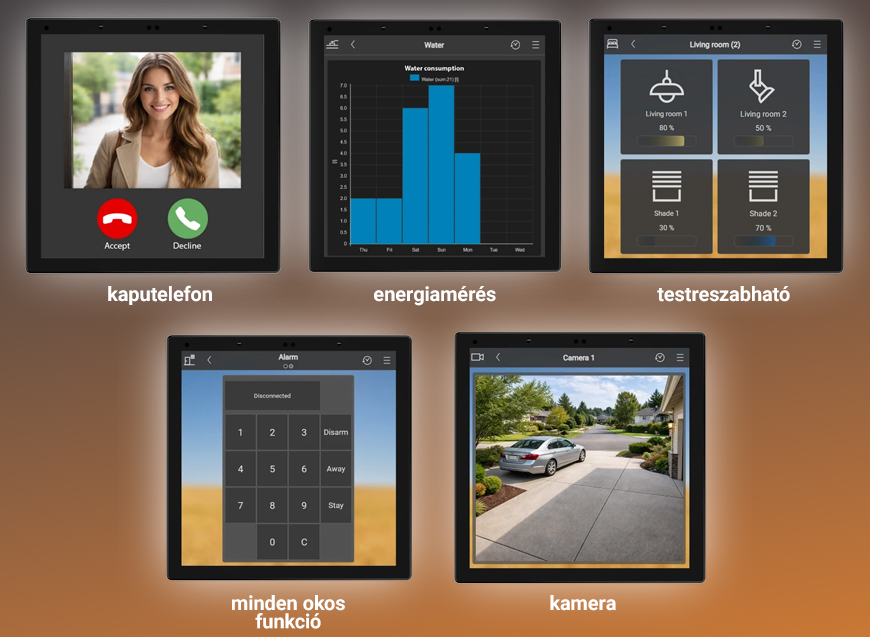 A multimédiás vezérlés ugyancsak természetes része a panelnek. A felhasználó egyszerűen szabályozhatja a különböző helyiségek hangerejét, válthat zenei forrást, vagy akár teljes audiozónákat kezelhet.